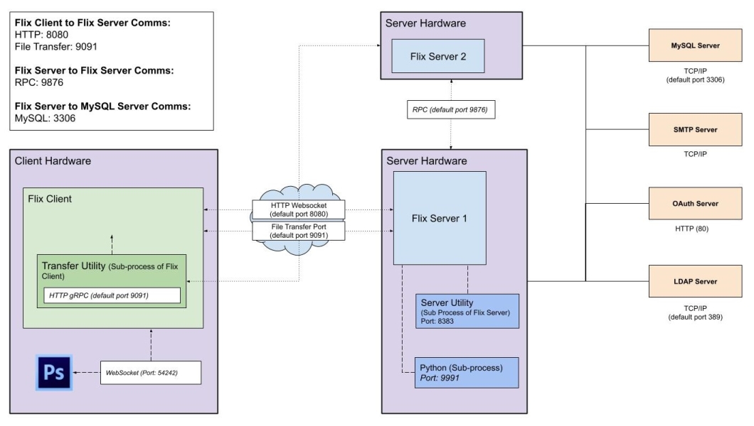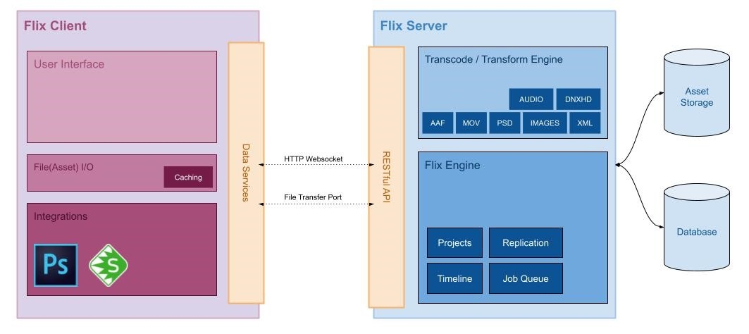 Flix is a client / server architecture application. The client (Flix Client) is the user interface for interacting with Flix, creating boards, viewing sequences, and interaction with third-party tools like Photoshop. The server side (Flix Server) is where the bulk of Flix’s processing takes place. Flix Server provides a RESTful HTTP API for Flix Client, or custom scripts, to consume. Communication between Flix Client and Flix Server is done over HTTP(S) and Websockets.