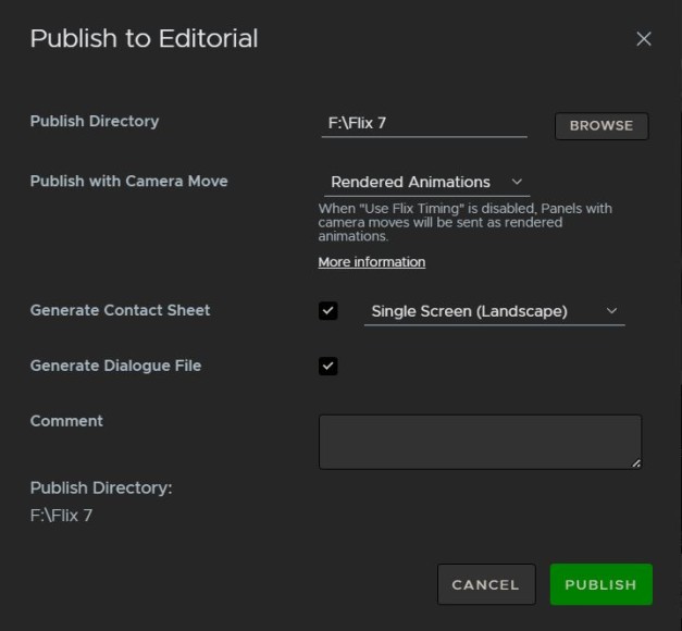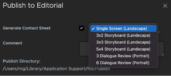 Note: If no new changes have been made to the sequence revision, clicking the Publish to Editorial button opens the directory to which your files have been published. If files are missing from the publish directory, Flix automatically downloads them from the server and stores them in the publish directory.