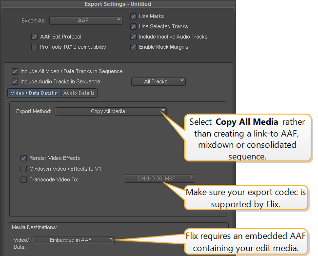 The Audio Details tab controls how audio is exported from Avid. Audio can severely impact the file size of AAFs exported from Avid to Flix.