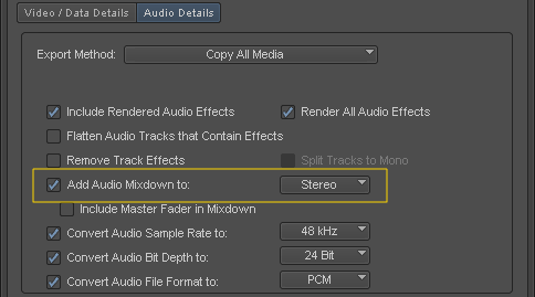 • Disable Add Audio Mixdown (recommended) - manually mixdown the audio before export to AAF.