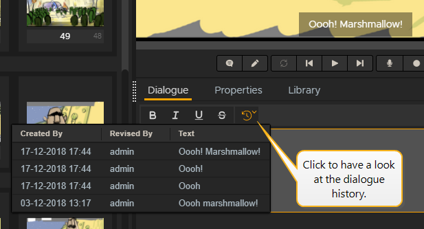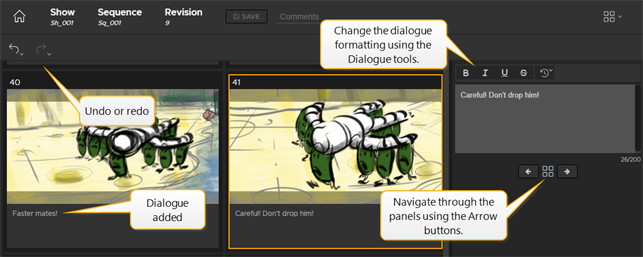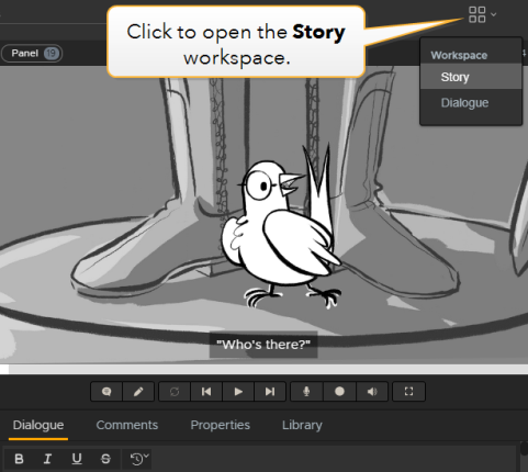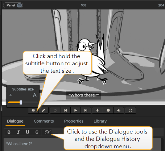 You can easily add dialogue to your panels in both the Story and Dialogue workspaces. Dialogue is displayed as subtitles in the Player, which you can turn on and off.