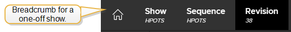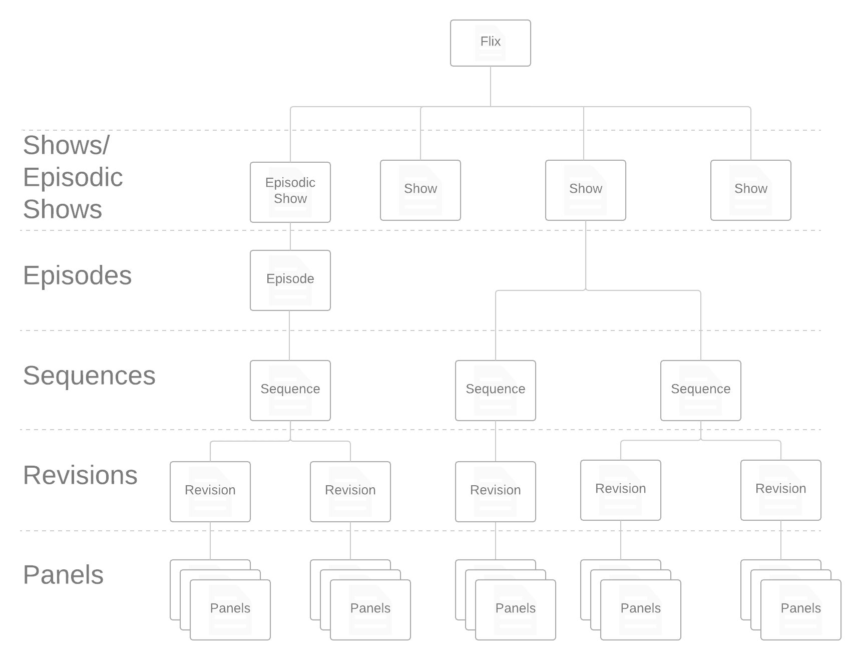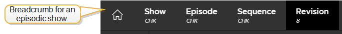 When you first log in to Flix, the Shows level displays the shows you are assigned to. The diagram below shows the hierarchy of how shows are organized along the breadcrumb. The breadcrumb is used to navigate back and forth through the levels of a project.