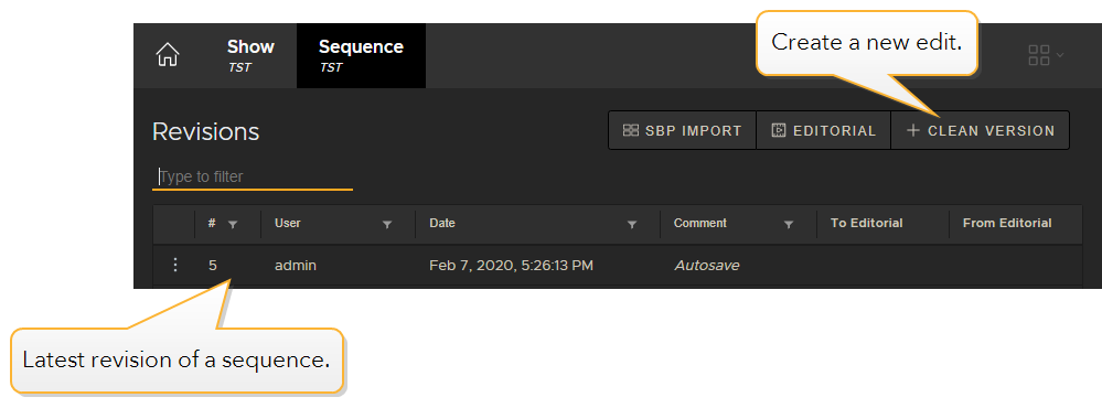 At the Sequences level, the most recent edit, or sequence revision, is always at the top of the list. If the list is long, you may want to use the filter to search for a specific comment. For example, "George's version".
