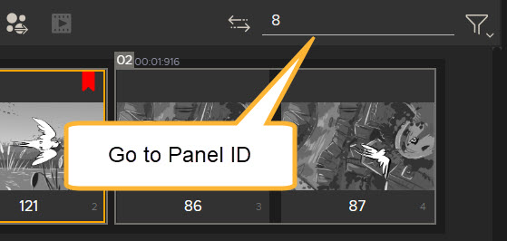 A sequence can contain hundreds of panels, but you can search by panel ID in the dedicated search bar to quickly locate the panel you need. Enter a panel ID and press Enter to select any match in the sequence.