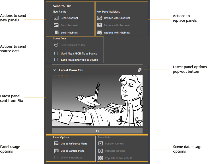 Send to Flix - The upper part of the plugin contains the actions to send or replace panels in Flix using snapshots or playblasts.