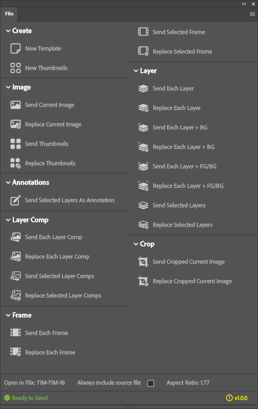 Note: Both Photoshop and Flix need to be open for these actions to work.
