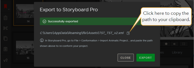 Tip:  You can copy the path from the Export to Storyboard Pro menu in Flix by clicking the