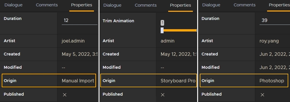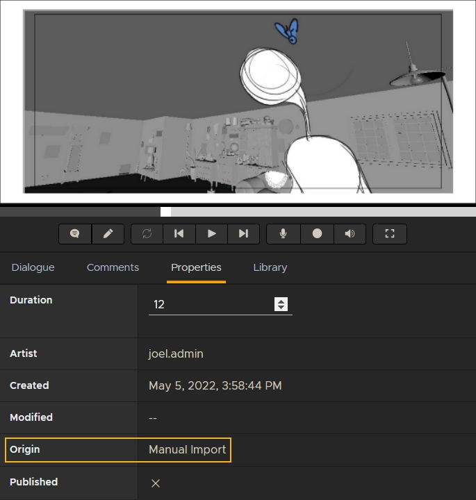 The .xml Flix generates for the export includes Flix metadata for each panel in the revision, including new panels that Storyboard Pro has never seen. When these new panels are sent back to Flix from Storyboard Pro, Flix looks for that metadata to version them up instead of creating new panels with new IDs, which helps avoid confusion resulting from the ID change. The metadata is displayed in the panel Properties tab under Origin.