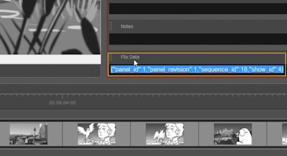 Exporting panels from Flix writes metadata into each panel containing its ID, revision, sequence, and show information. You can see that metadata in Storyboard Pro in the Flix Data field associated with each panel.