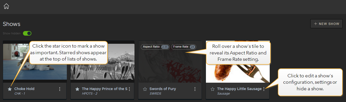 From here you can open an existing show, create a new one or set user preferences for shows.