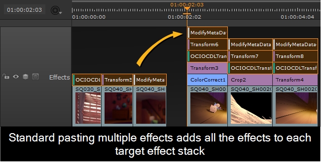 Unlike standard paste, sequential paste only pastes each effect once, in the order that they appear on the source shots.