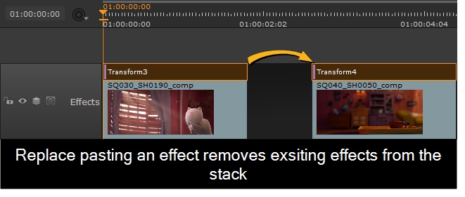 Replace paste copies the source effect(s) to the target shot and removes any existing effects on the shot.