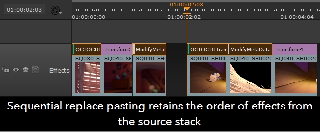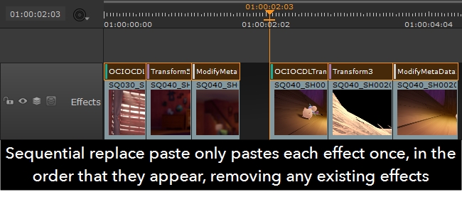 Sequential replace paste only pastes each effect once, in the order that they appear on the source shots, removing any existing effects from the target shots.