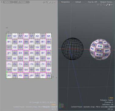 | 8. | アプリケーションメニューから、 Items選択モードで、次にミラーリングされた球のUVをUV Viewport。 |