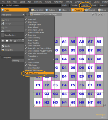| 9. | とともにUVレイアウトを開き、左側のパネルで、 UVサブタブをクリックし、 Flip >Flip U。 |