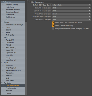 Apply Color Correction Profile to Legacy LXO files:これを有効にして、デフォルトの色補正プロファイルを事前に適用します。Modo 801 .lxoファイル。これらのファイルは、OCIOの使用以前のものです。したがって、使用しないことが望ましい場合がありますModoファイルのロード時のデフォルトの色補正。ファイルは別の方法ですでに補正されている可能性があるためです。このため、デフォルトではオフになっています。