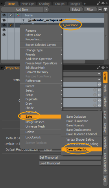 | 4. | の中にItem List右側のパネルで、メッシュアイテムを展開し、右クリックします。 *_lowShapeアイテム、および選択Bake >Bake to Alembicコンテキストメニューから。 |
