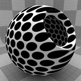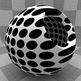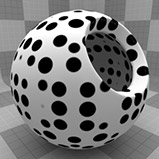 のDotsテクスチャは、メッシュの表面全体に格子状のドットパターンを作成します。ドットのデフォルトは、ハードエッジのあるかなり均一な位置ですが、オプションを変更して、さまざまな配置やソフトランプドットを設定できます。ドットはレンダリング時に手続き的に作成されます。テクスチャには固定解像度がなく、拡大しても詳細な視覚的損失はありません。