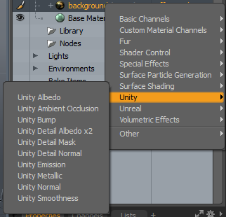 Unityマテリアルを作成するには、 Shader Tree、クリックAdd Layer > Custom Materials > Unity Material。に材料が追加されますShader TreeとレイヤーのPropertiesパネルが表示されます。