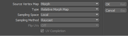 Type:転送操作の頂点マップのタイプを指定します。両方のマップ(ソースとターゲット)の機能は同じでなければなりません。たとえば、カラーの頂点マップをモーフマップに転送することはできません。