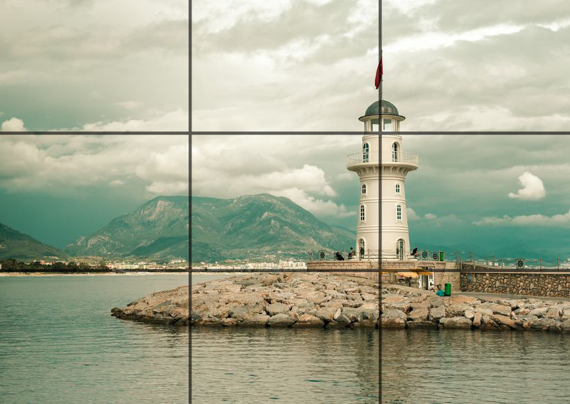 上の画像は、実際の3分の1のルールを示しています。合成技法を示すために、3分の3グリッドがオーバーレイされています。海岸線と灯台がグリッド線にぴったりと合っていることに注目してください。