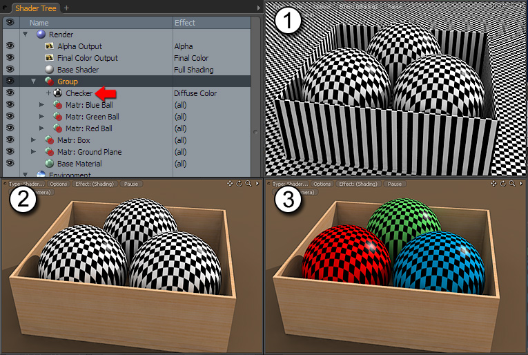 以下の例では、3つの色の球、ボックス、および地面があります。の中にShader Tree、3つの色の球体がグループ化されて未定義になっていることがわかりますMaterial Group。グループの親のすぐ下に、チェッカーボードテクスチャが追加されています(赤い矢印の横)。ツリー内の他のすべてのレイヤーの上にあり、その上のグループは定義されていないため、例1に示すように、シーン全体に影響します。