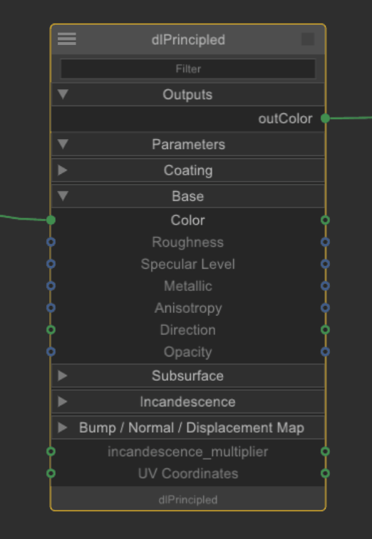Tip: In the same way as the terminal sidebar, you can type in the Filter field of the shading nodes to quickly search for an input/output, even if the menu is not expanded. You can show and hide the Filter function on selected nodes using the Alt+Enter keyboard shortcut.
