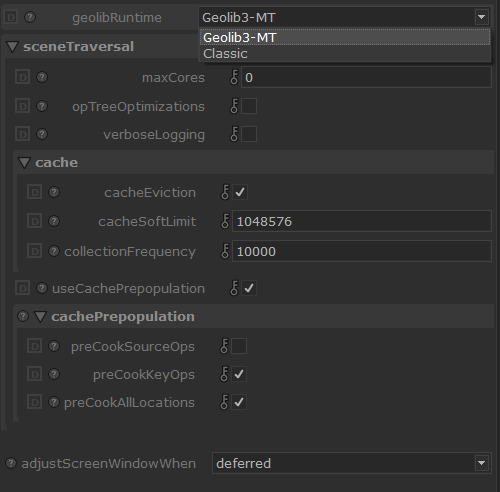 • sceneTraversal.cachePrepopulation.preCookAllLocations - turned on by default, Geolib3-MT will cook all remaining scene graph locations, fully expanding the scene.