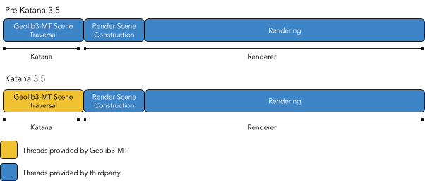 Determines how many logical cores Geolib3-MT will use during scene traversal phase. Unlike previous versions, Geolib3-MT uses an internal thread pool to improve scene traversal time. The following diagram demonstrates the difference between Geolib3-MT and previous versions of Katana.
