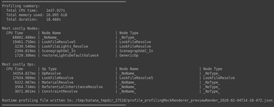 In addition to the summary report, a JSON file containing the raw profiling data is written to disk. The directory it is written to is determined by the --profiling-dir command-line option; if this is not set, it will be written to the temporary directory for the Katana session. If this directory does not exist, it will be created (if filesystem permissions allow). The filename takes the following format: