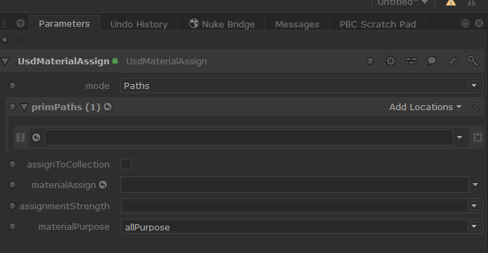 The UsdMaterialAssign node assigns USD materials to geometry, either using Paths or PBC expressions. Its assignmentStrength and materialPurpose can also be set.
