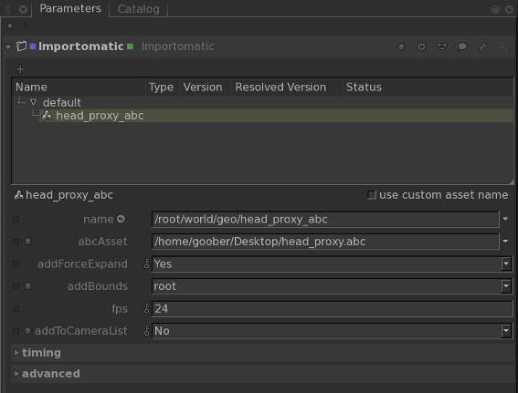 The Add Casting Sheet option of the Importomatic node opens a .cast file (casting sheet) that contains assets and names for those assets. This allows you to load multiple alembic files at once.