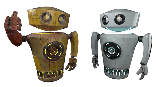 Each of the robots' materials share a transmission mask, roughness and emissive texture files, and require the same glass shader.