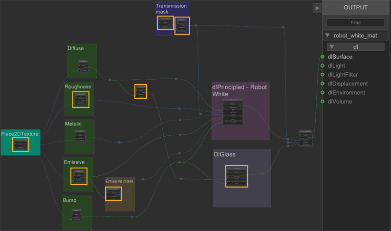 In this example there are two robot characters each requiring a different material variation. The ability to create multiple NetworkMaterials from one NetworkMaterialCreate node is very useful in this situation as each material variation uses some of the same textures and masks.