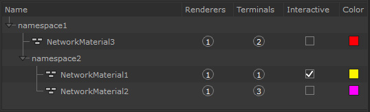 The Material Scenegraph also provides some information about each NetworkMaterial. You can see how many renderers and terminals are connected to each NetworkMaterial, set the interactive state of a NetworkMaterial, and assign it a color.