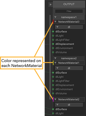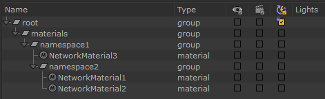 NetworkMaterials and Namespaces organized in the Material Scenegraph |