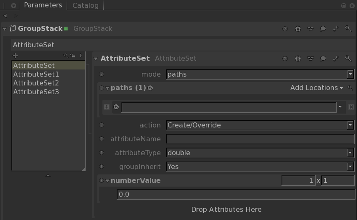 In the node graph, select any nodes you want to place in a GroupStack node, then Shift+middle-click and drag them onto the GroupStack node’s list pane in the Parameters tab. The nodes are transferred to the GroupStack node, and are editable in the GroupStack node’s Parameters tab. GroupStack nodes have additional Parameters tab options for adding, and editing nodes of their selected type. Above the list pane in a GroupStack node’s Parameters tab are icons to add additional nodes of the selected type, filter the list of nodes, and lock highlighted nodes. Highlighting an entry in the list pane and pressing the D key also disables the selected entry.