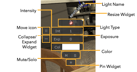 Click to toggle. Only soloed lights are included in renders. All lights which are not solo-ed are muted and therefore omitted from renders. - Click the star button to pin a light parameter widget, preventing the light parameter widget from closing when the light is deselected.