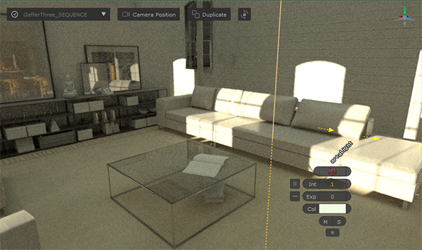 Lighting Tools makes it easy to switch between different GafferThree nodes, they are all displayed in a dropdown list in the Hydra Viewer when Lighting Tools is enabled.