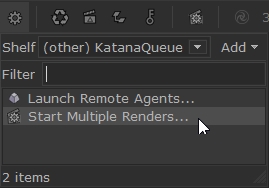 at the top of the Katana UI. - Select (Other) KatanaQueue from the Shelf dropdown.