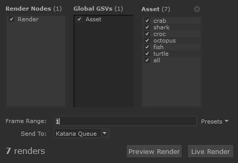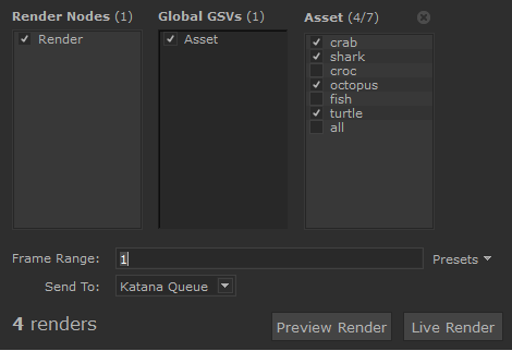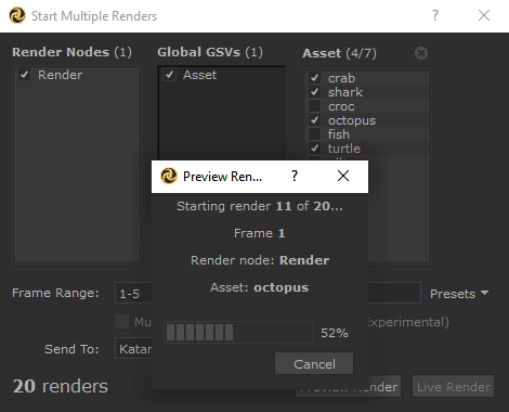 The Start Multiple Renders dialog allows users to start multiple Preview or Live Renders by selecting various combinations of global Graph State Variables (GSV). The ability to start multiple renders at once and have them render simultaneously can greatly improve efficiency as you don't have to wait for one render to finish before starting another. This can be very useful to compare lighting adjustments across multiple shots, or material and asset variations, for example.