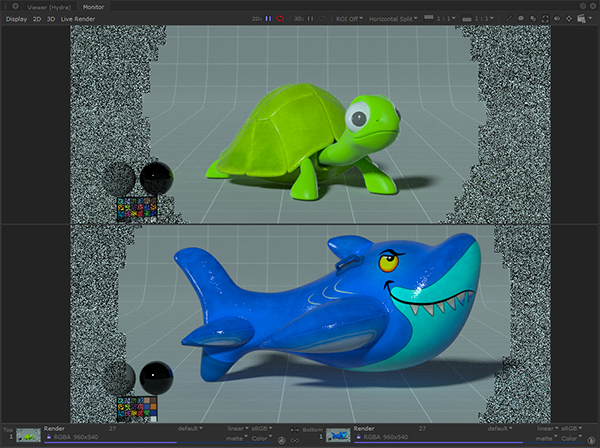 Live Renders are useful for getting immediate feedback on changes you make to objects, cameras, lights, and materials. Within a Live Render session, changes to materials and object transformations on specified scene graph locations are communicated to the renderer.
