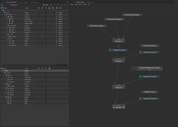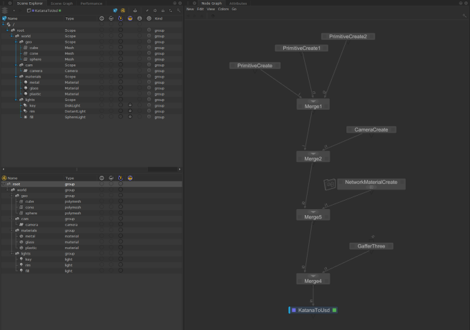 In the example below we are using the KatanaToUsd node to convert all of our Geolib data to USD data, including geometry, cameras, materials and lights.