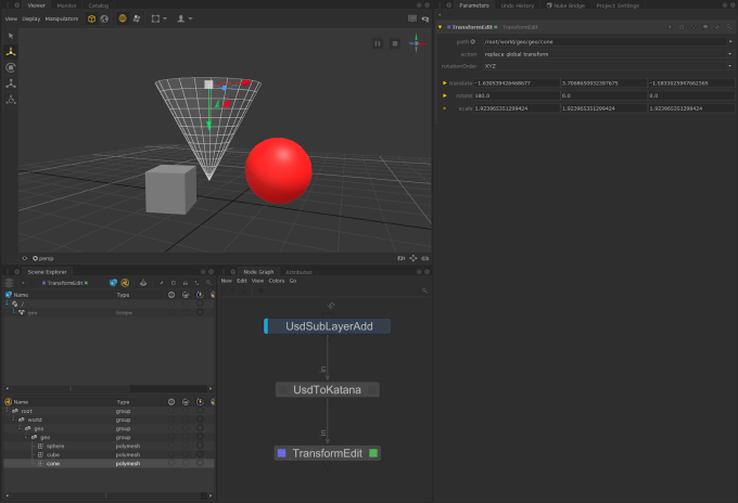 The KatanaToUsd node and the UsdToKatana node are conversion nodes used to get data from Katana’s Geolib space to USD’s native space and vice versa.