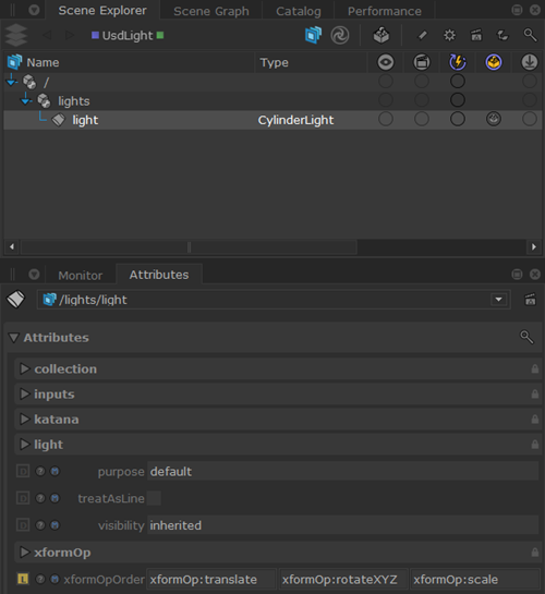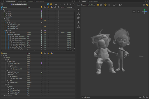 The Scene Explorer tab provides a unified scene graph view of both USD and Katana data so that you can easily traverse and manipulate the hierarchical structure of the entire asset library.
