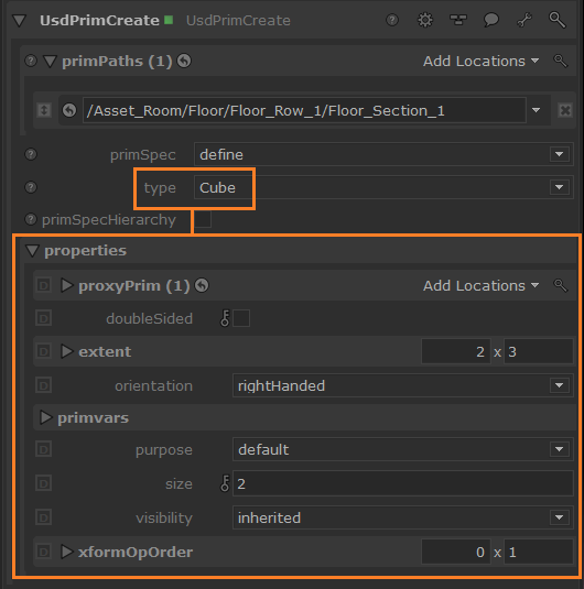 Additionally, there are more specialised nodes, such as UsdCamera, UsdScope and UsdXform nodes, based on the UsdPrimCreate but with parameter tailored for each purpose, allowing you to create different types of prims easily. For cameras, see Creating Native USD Cameras.