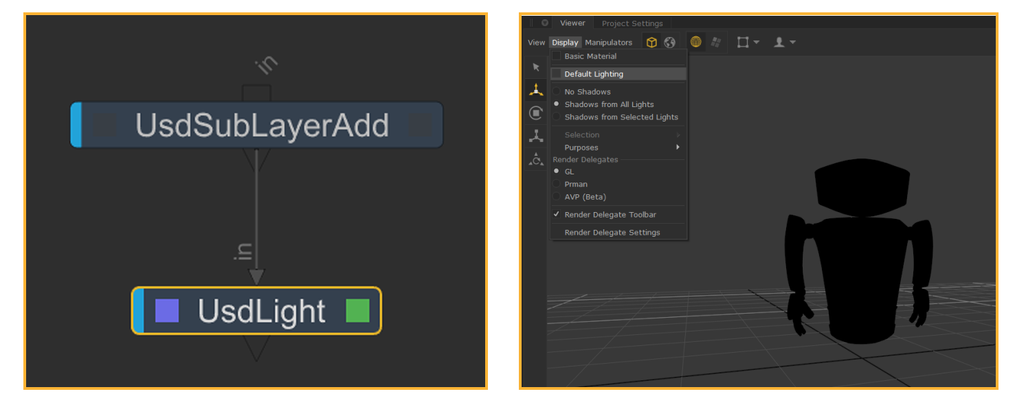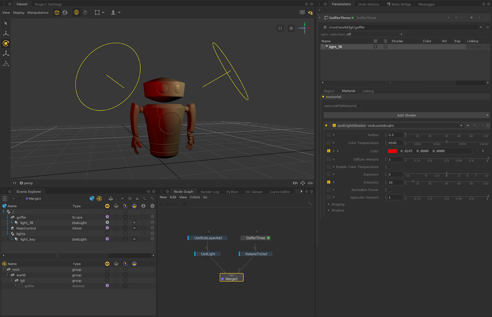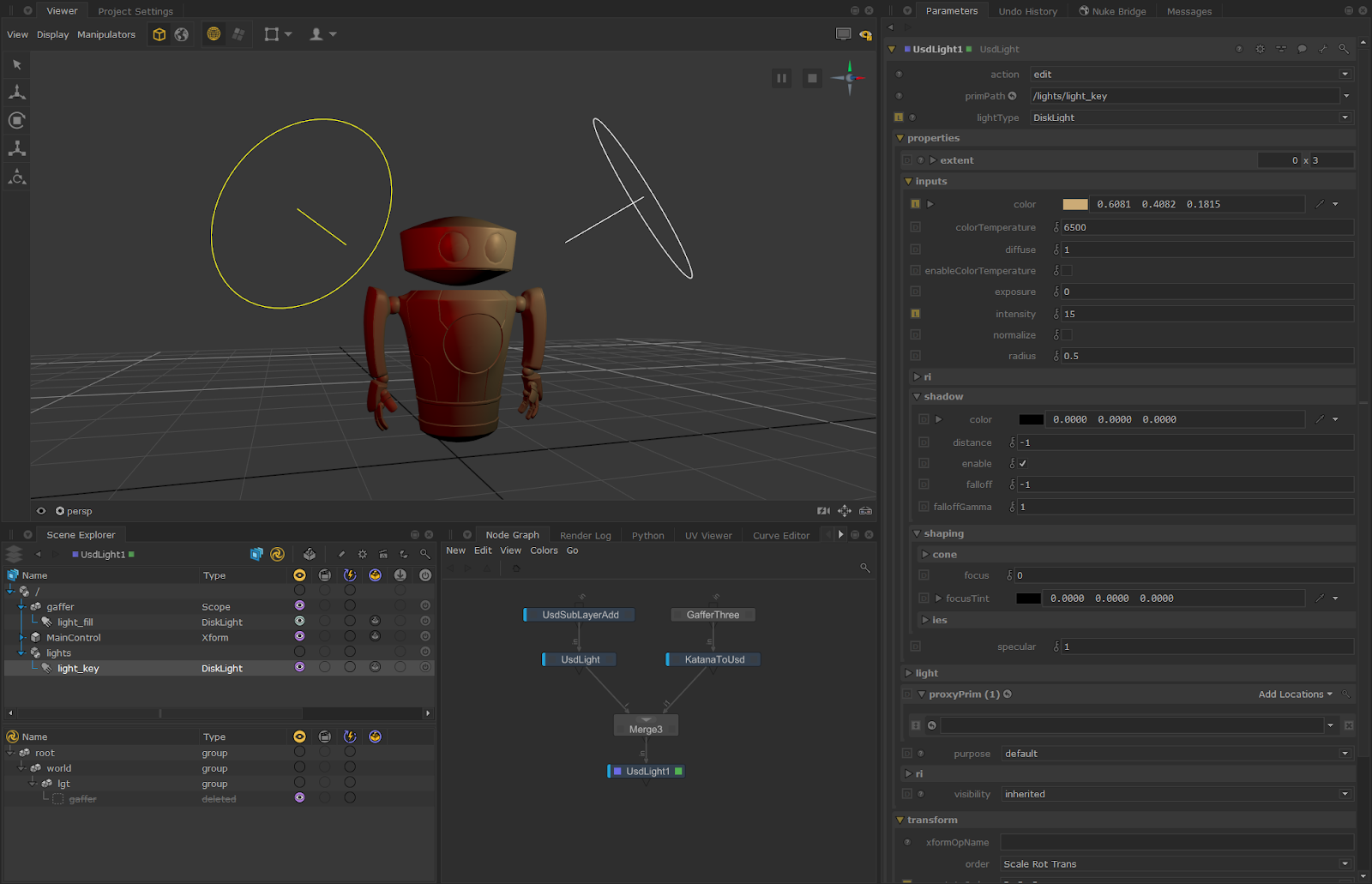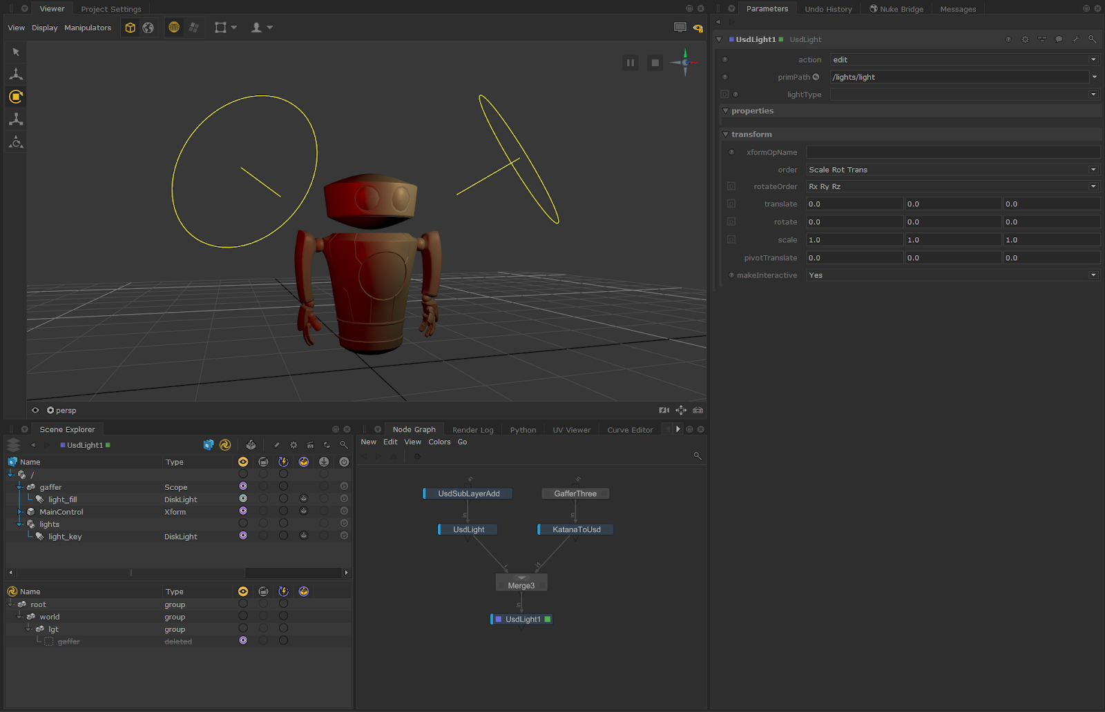 Creating USD lights in Katana can be done natively using the UsdLight node or by converting Katana lights to USD lights using the KatanaToUsd node. The example below showcases a simple lighting setup using a combination of the above.