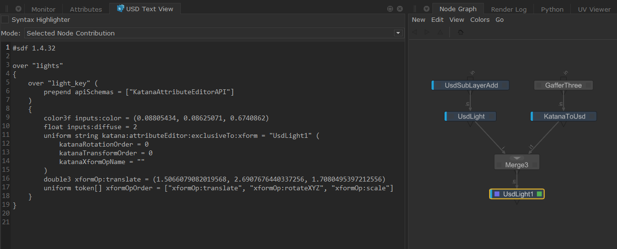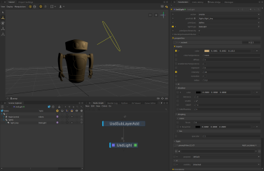 In edit mode, UsdLight will read the light primitive, dynamically set the lightType, and show incoming values in the Parameters tab. Any adjustments made will be set as an ‘over’ on the light primitive. We’ll use the previous example to show this.