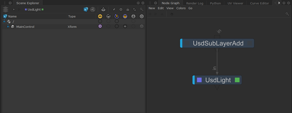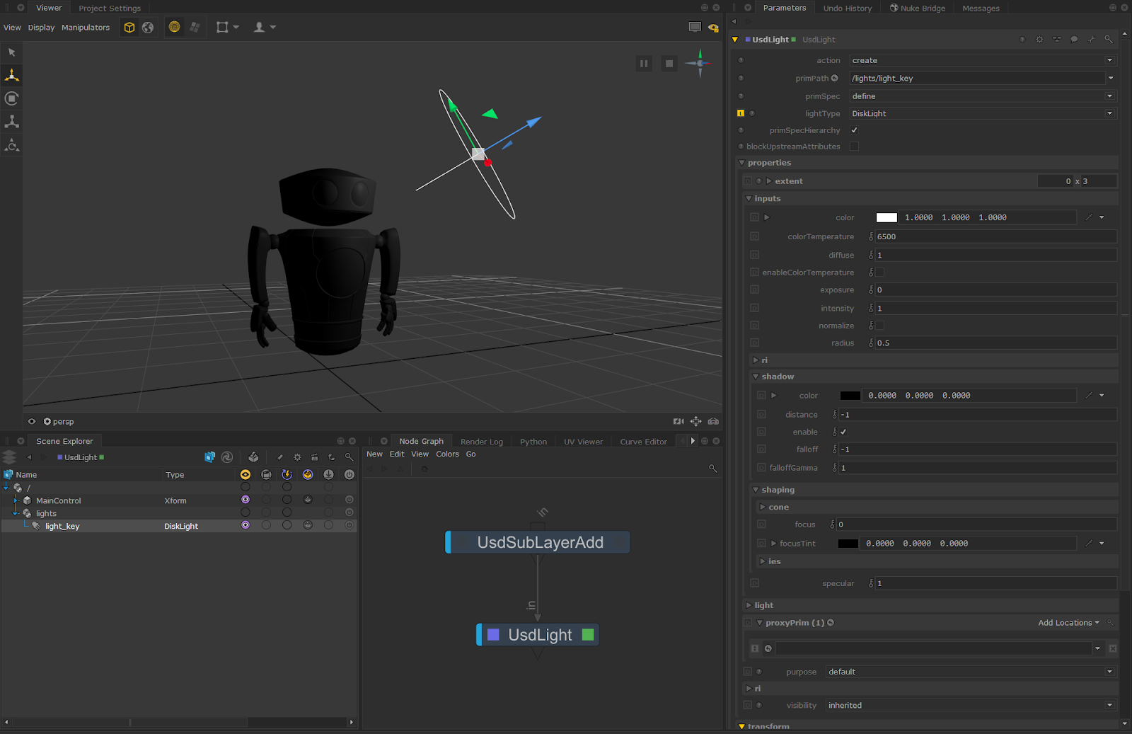 Tip: Each UsdLight node allows you to create one light at a time. While this node might be useful for smaller lighting setups, in most cases using the UsdGaffer node will be more flexible and faster as it allows the creation of multiple lights in one USD layer - see Using UsdGaffer.