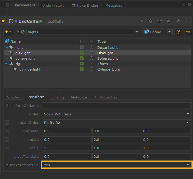 You can also right click on the light prim in UsdGaffer treeview and select Enable Interactive Transforms or Disable Interactive Transforms. This has the same effect as the makeInteractive parameter by turning the ability to make transformations in the Viewer on or off.
